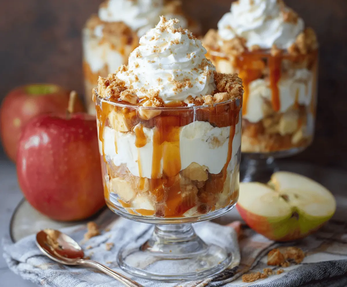 Delicious Apple Pie Trifle layered with fresh apples, vanilla pudding, and cinnamon cookie crumbles.