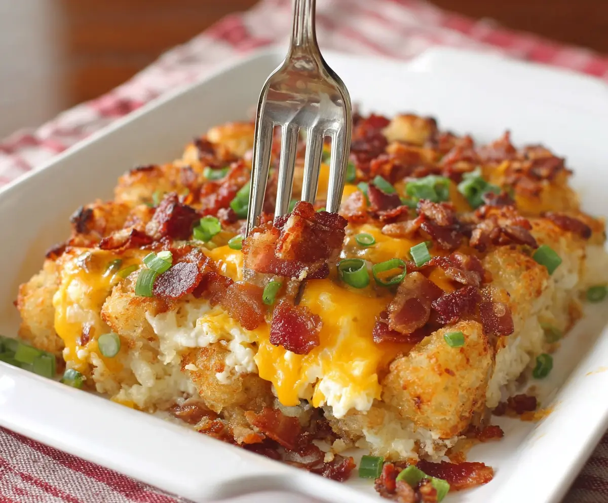 This Bacon Egg and Tater Tot Casserole is a tasty mix of crispy bacon, fluffy eggs, and golden tater tots. It’s like breakfast and comfort food rolled into one!