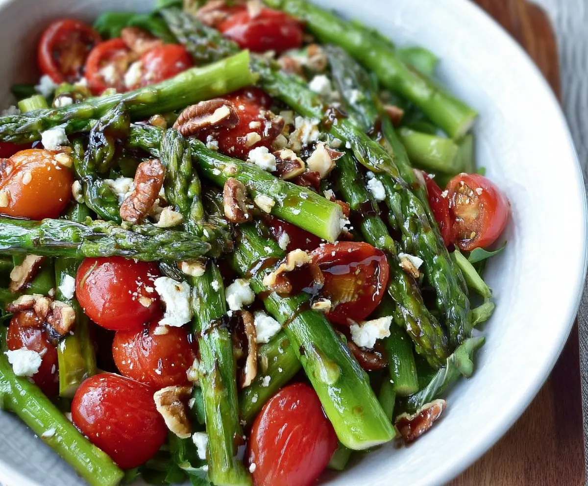 In a large salad bowl, combine the blanched asparagus, halved cherry tomatoes, and toasted pecans. These ingredients not only look colorful but will taste amazing together!