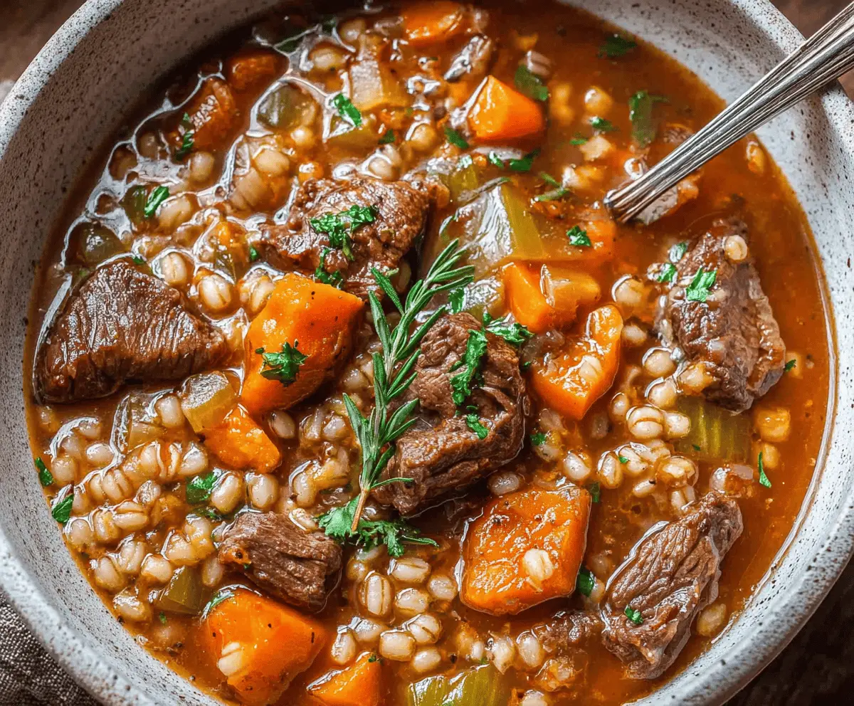 Hearty beef and barley soup in a bowl with fresh herbs, showcasing tender beef chunks, pearl barley, carrots, celery, and vegetables for a comforting, nutritious meal.