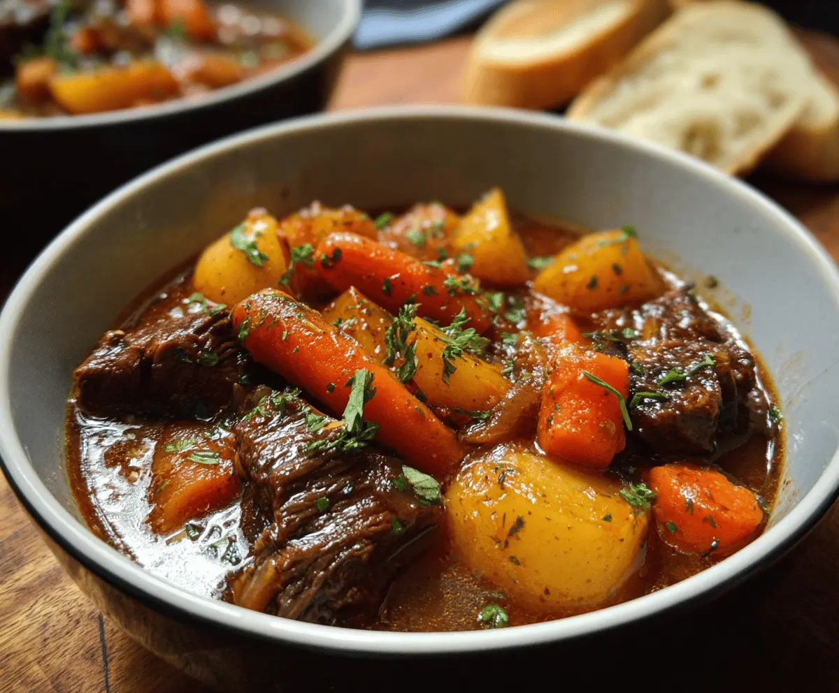 Serve the hot stew in bowls, garnished with chopped fresh parsley. Pair it with some crusty bread for a perfect meal!