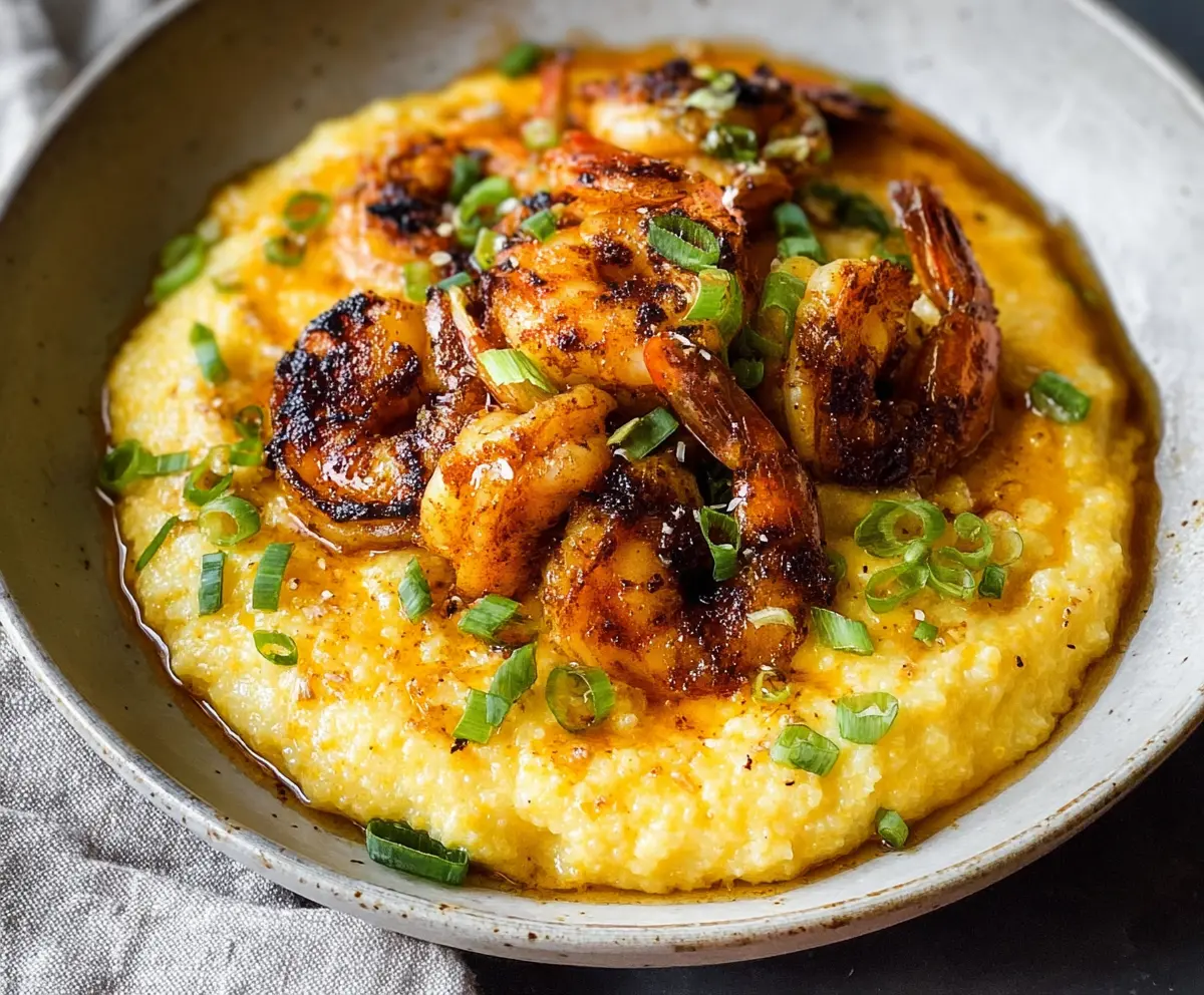 This dish features spicy, blackened shrimp served over creamy, cheesy grits. It’s a warm and satisfying meal perfect for any time of day!