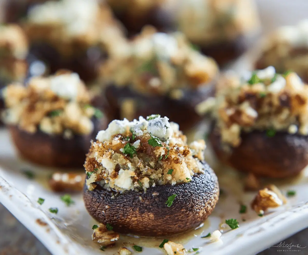 These blue cheese and walnut stuffed mushrooms are a tasty treat! The tender mushrooms are filled with a creamy and tangy cheese mix, plus the crunch of walnuts, making each bite full of flavor.