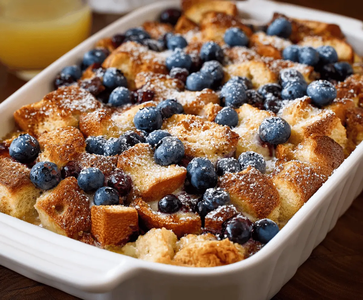 This Blueberry French Toast Casserole is a fun and tasty breakfast dish! It combines soft bread, fresh blueberries, and a creamy egg mix baked to perfection.