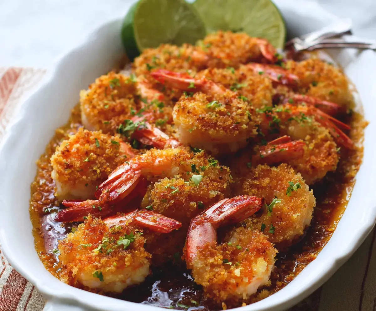 Once baked, take the shrimp out of the oven and sprinkle some fresh chopped parsley or cilantro on top for a burst of color and flavor. Serve them hot with lime wedges on the side for squeezing over the top when you dig in!