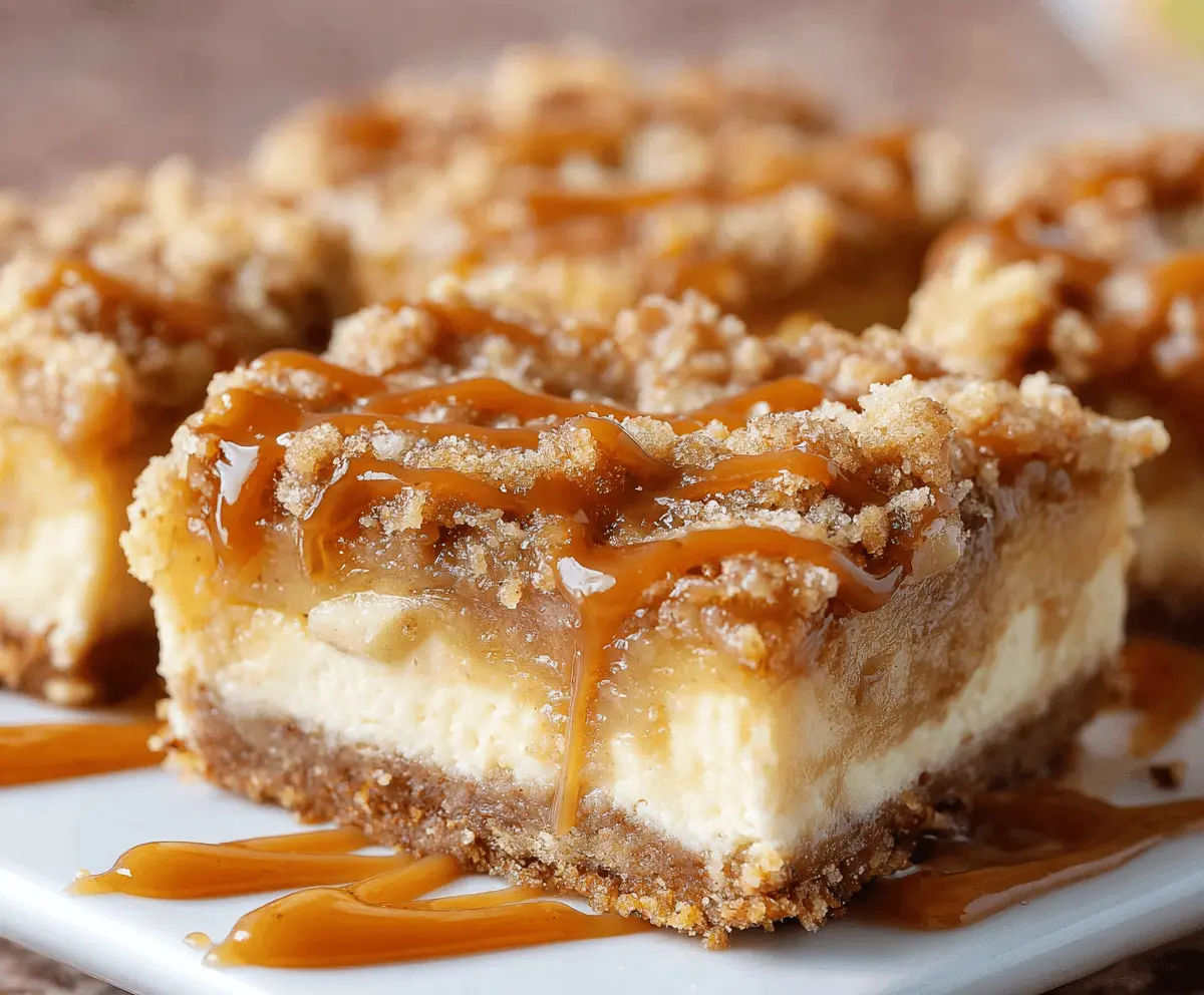 These Caramel Apple Cheesecake Bars are a sweet treat with a creamy cheesecake layer and tasty bits of apple, all drizzled in sticky caramel. Perfect for sharing or enjoying all by yourself!