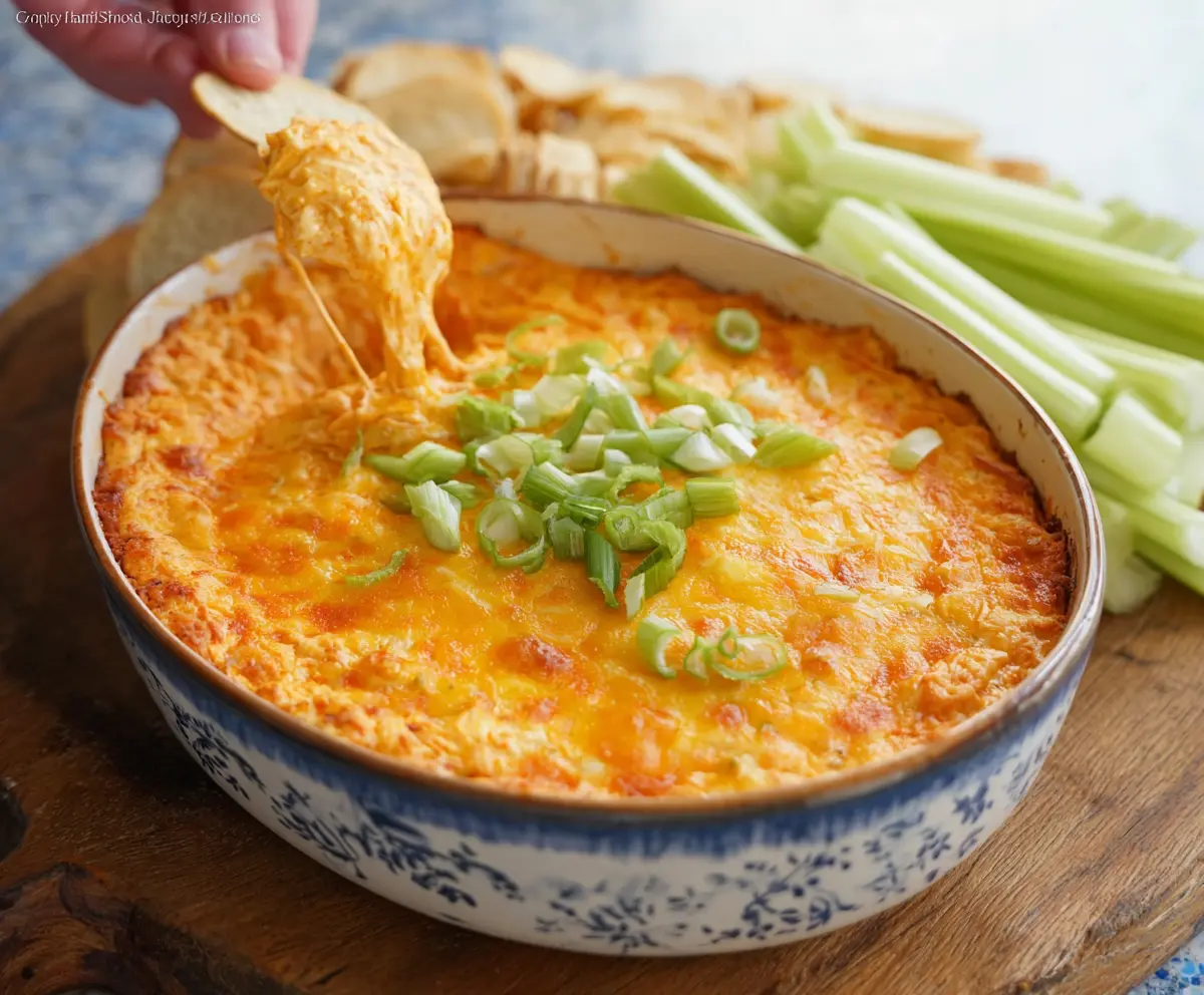 Once done, carefully remove the dip from the oven. Garnish with extra chopped green onions for a fresh touch. Serve warm with celery sticks and tortilla chips for dipping.
