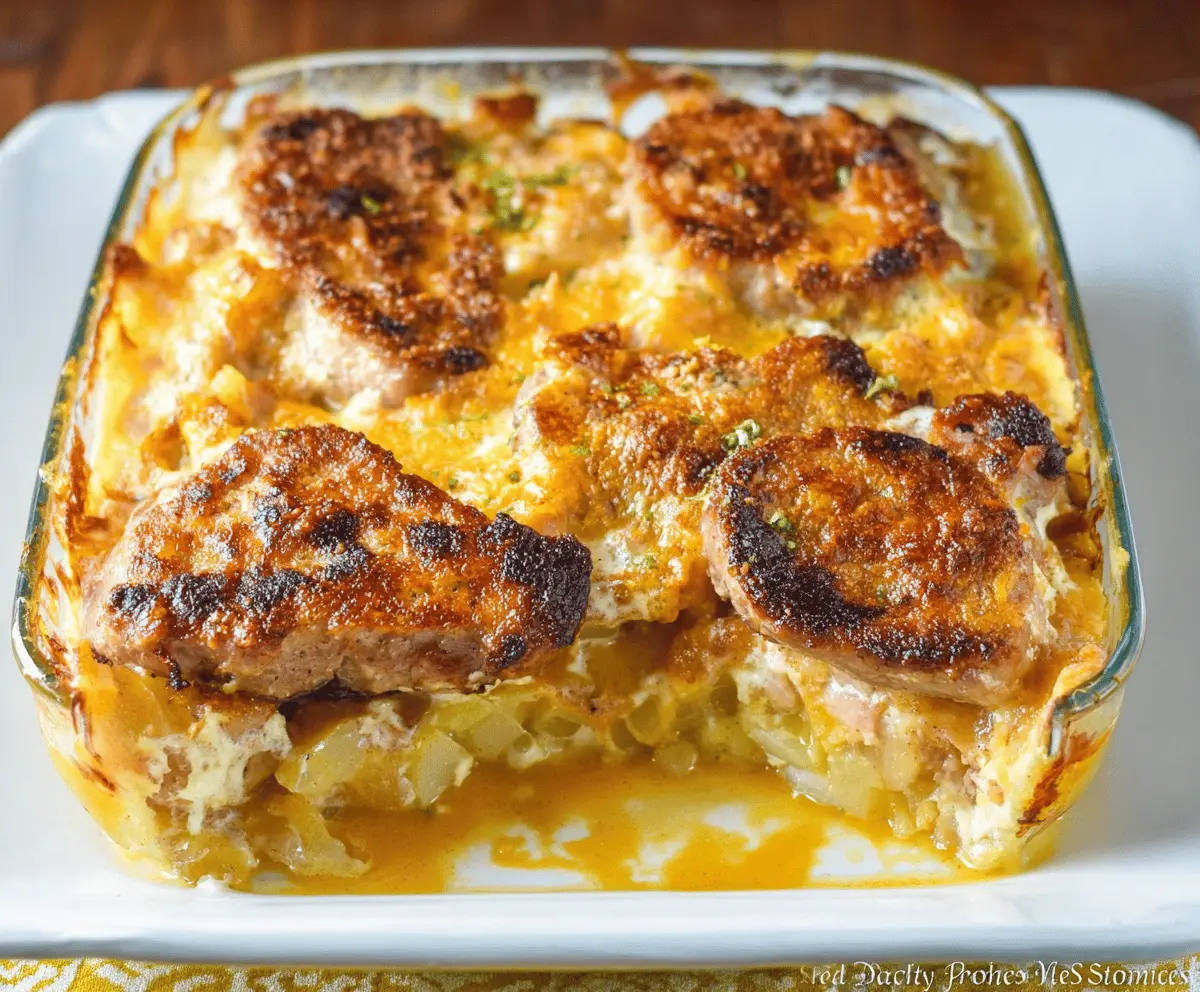 Enjoy this creamy, cheesy pork chop and potato casserole with a crispy cheesy top and tender layers inside!