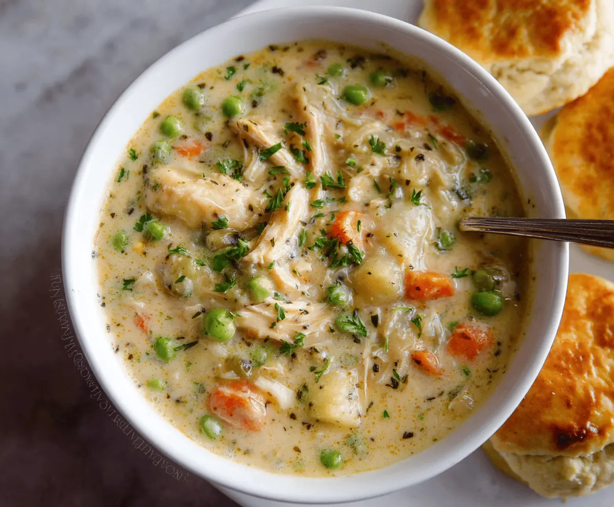 This Chicken Pot Pie Soup is a warm, cozy delight that combines tender chicken, tasty veggies, and creamy goodness all in one bowl! Perfect for chilly evenings!
