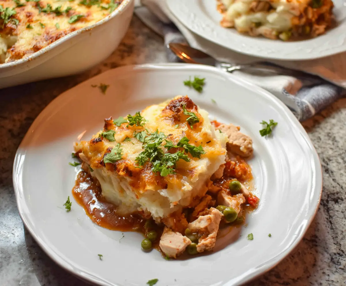 This Chicken Shepherd’s Pie is a warm and comfy dish with tender chicken, veggies, and a creamy sauce, all topped with fluffy mashed potatoes. It’s like a hug on a plate!