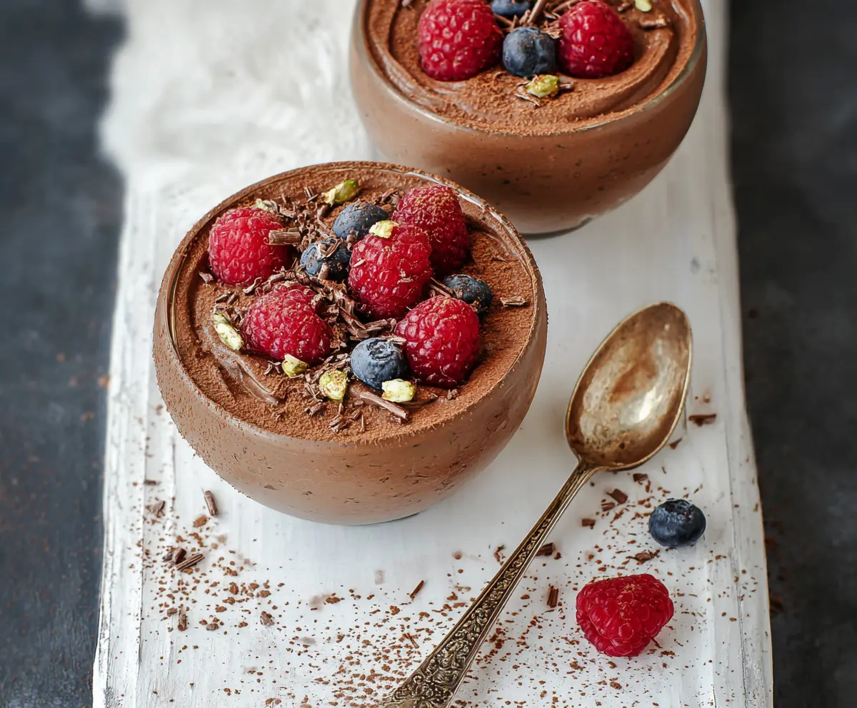 When you’re ready to serve, you can add a dollop of whipped cream or Greek yogurt on top if you like. Then, sprinkle on some fresh raspberries and blueberries, add dark chocolate shavings, and finish with a mint leaf for a lovely presentation. Serve chilled and enjoy your delightful, healthy chocolate treat!