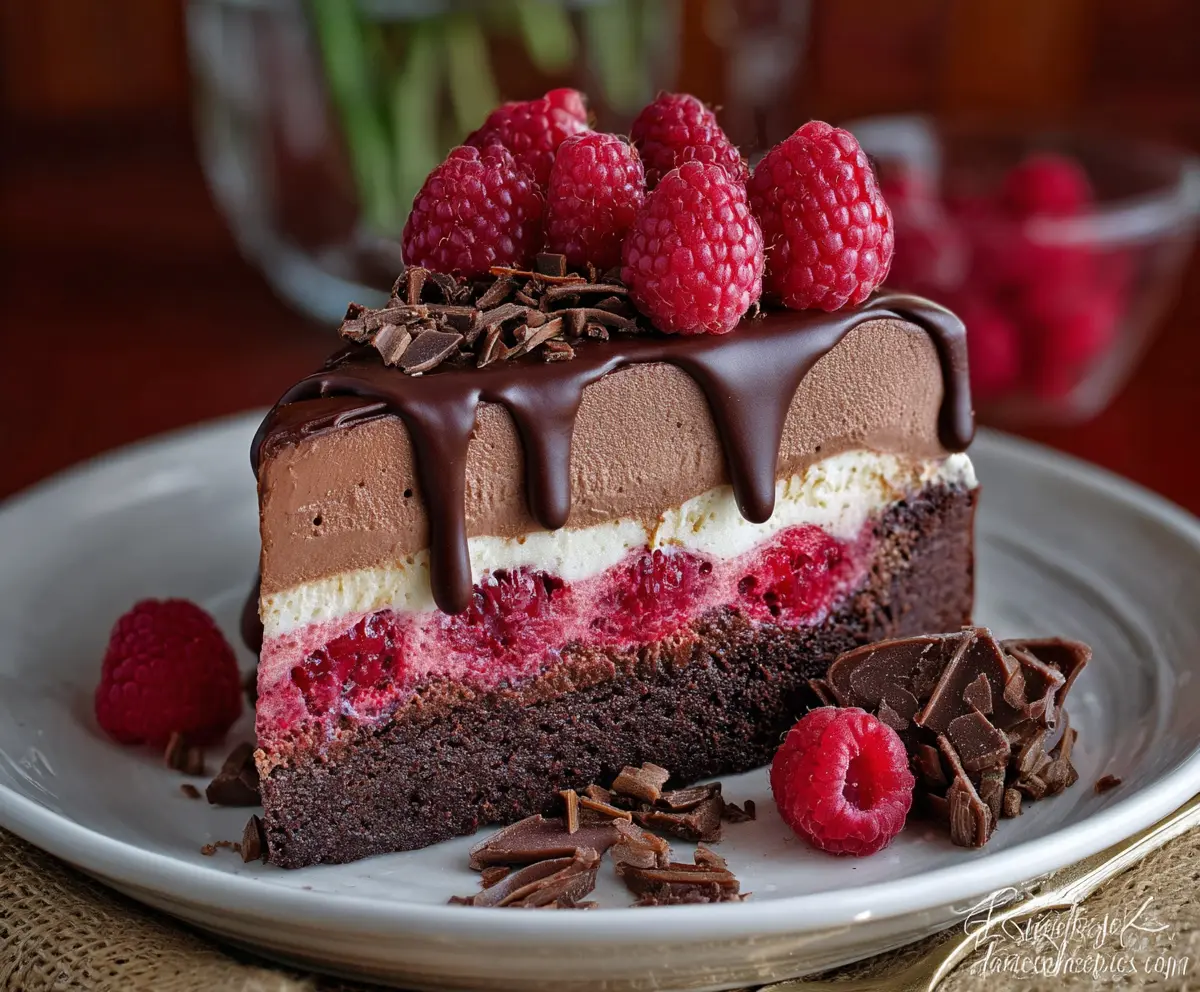 This Chocolate Raspberry Mousse Cake is a dreamy dessert! Layer upon layer of rich chocolate and tender raspberry filling make it simply irresistible.