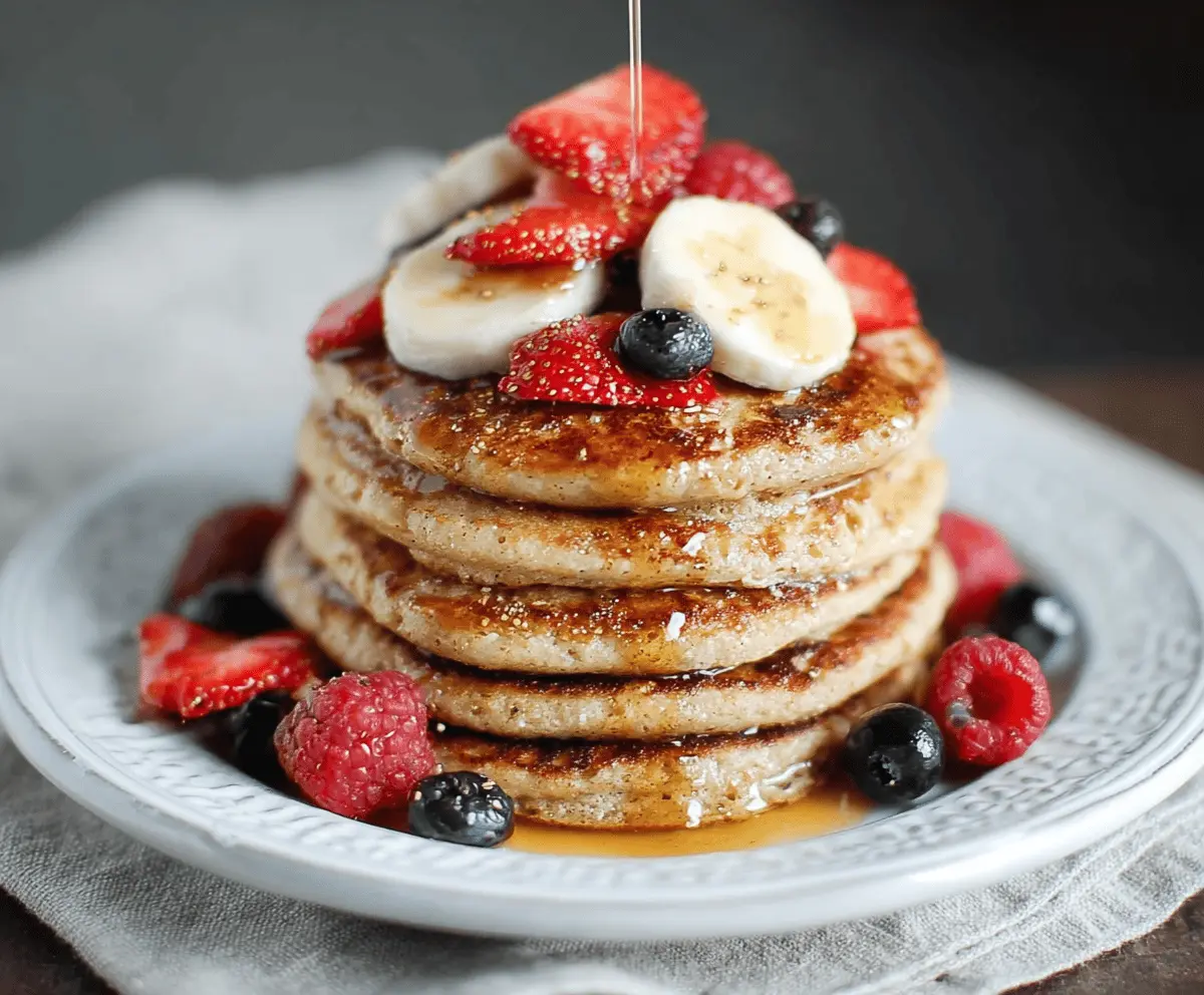 Once the pancakes are ready, stack them on a plate and top them with your favorite toppings! Add sliced banana, a mix of fresh berries, and a drizzle of honey or syrup. Feel free to sprinkle some seeds or chopped nuts on top for an extra crunch.