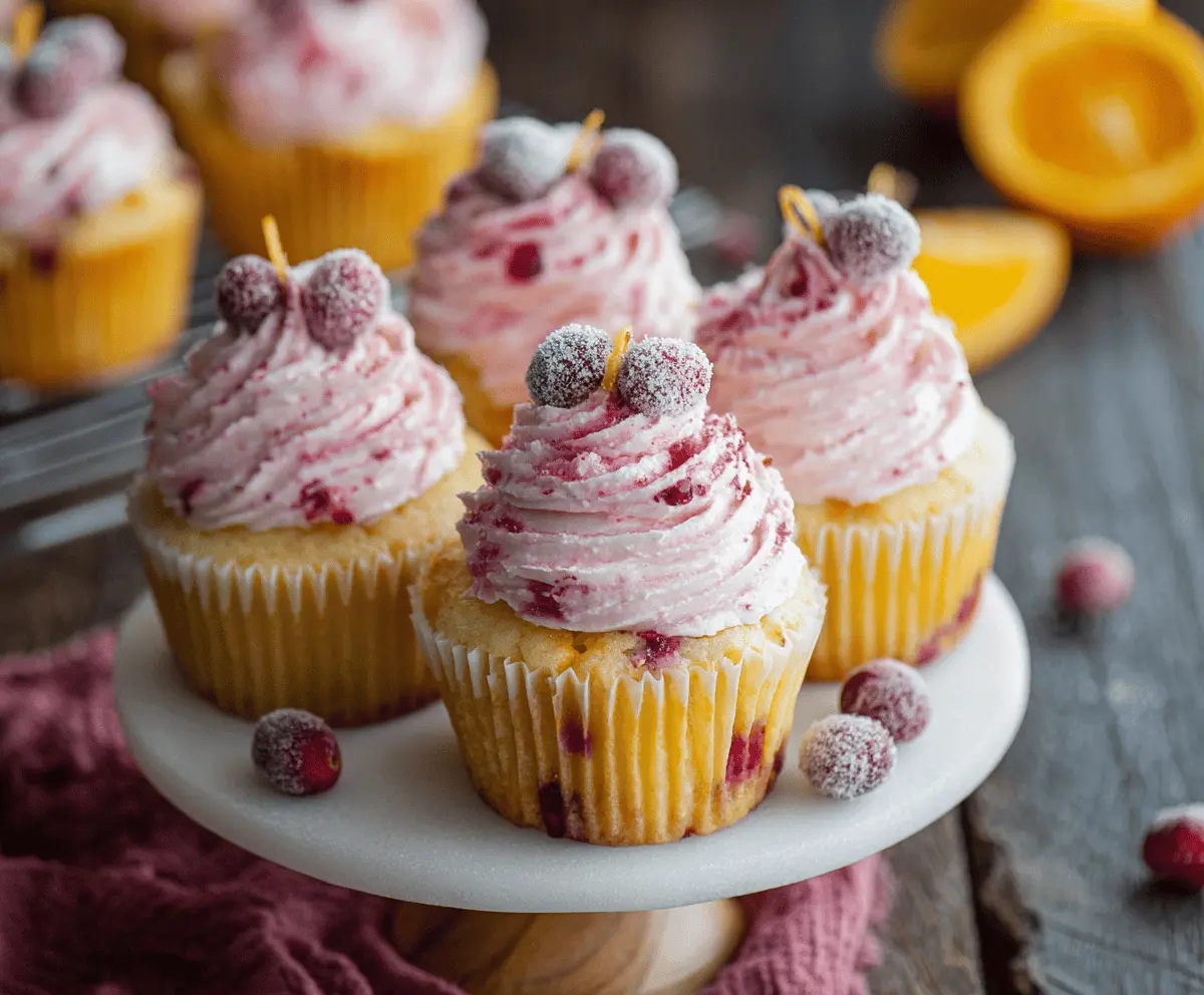 For a festive touch, decorate each cupcake with sugared cranberries and small segments of orange peel.