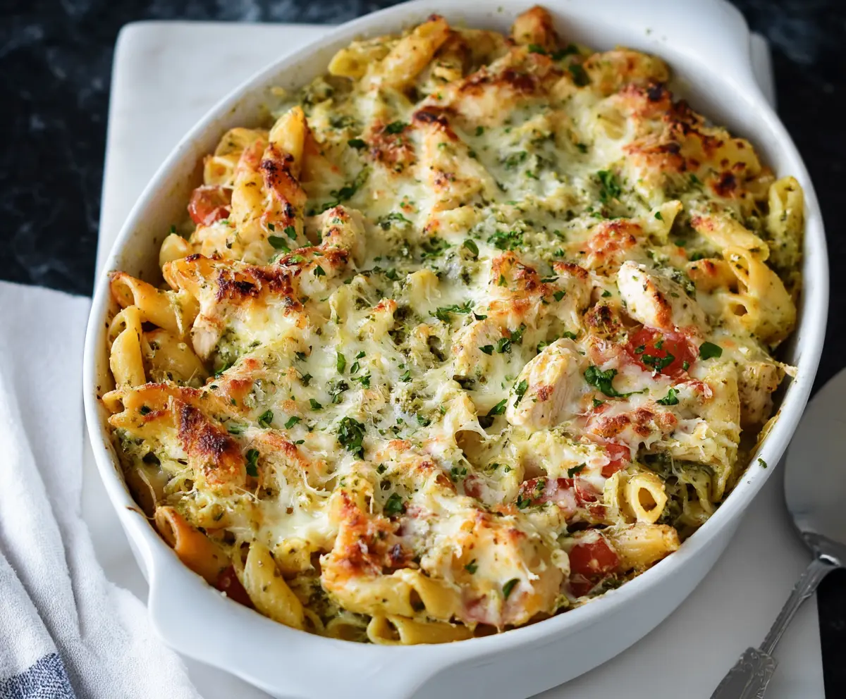Creamy Basil Pesto Chicken Pasta Bake