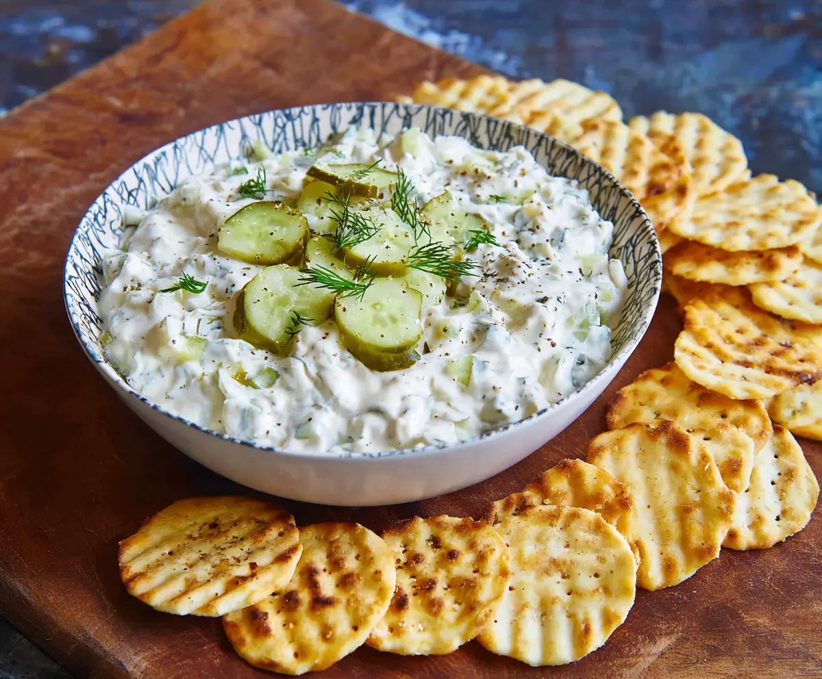 Transfer your dip to a serving bowl. For a nice presentation, garnish the top with a few pickle slices and maybe some fresh dill. Cover the bowl and pop it in the fridge for at least an hour. This helps all those tasty flavors blend together beautifully!