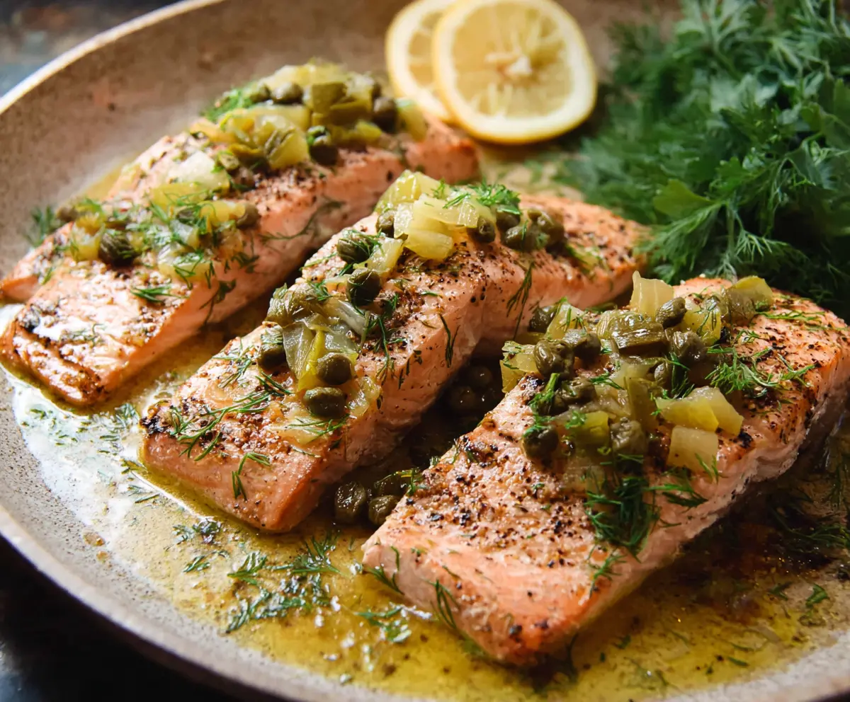 Once done, remove the skillet from the oven and garnish the salmon with extra fresh dill and lemon slices for a vibrant touch. Serve hot, spooning some of the tasty pickle and caper sauce over the top.