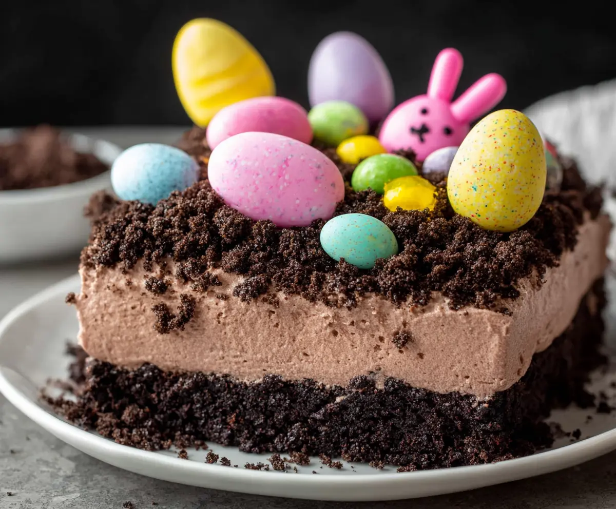 Arrange the candy Easter eggs on top of your dirt cake. For a little extra fun, create a small bunny figure in the center using whipped topping or frosting. You can use small candies or chocolate chips for the bunny’s eyes and nose. If you want to add ears, make some with the whipped topping and a bit of food coloring to give them a splash of color!