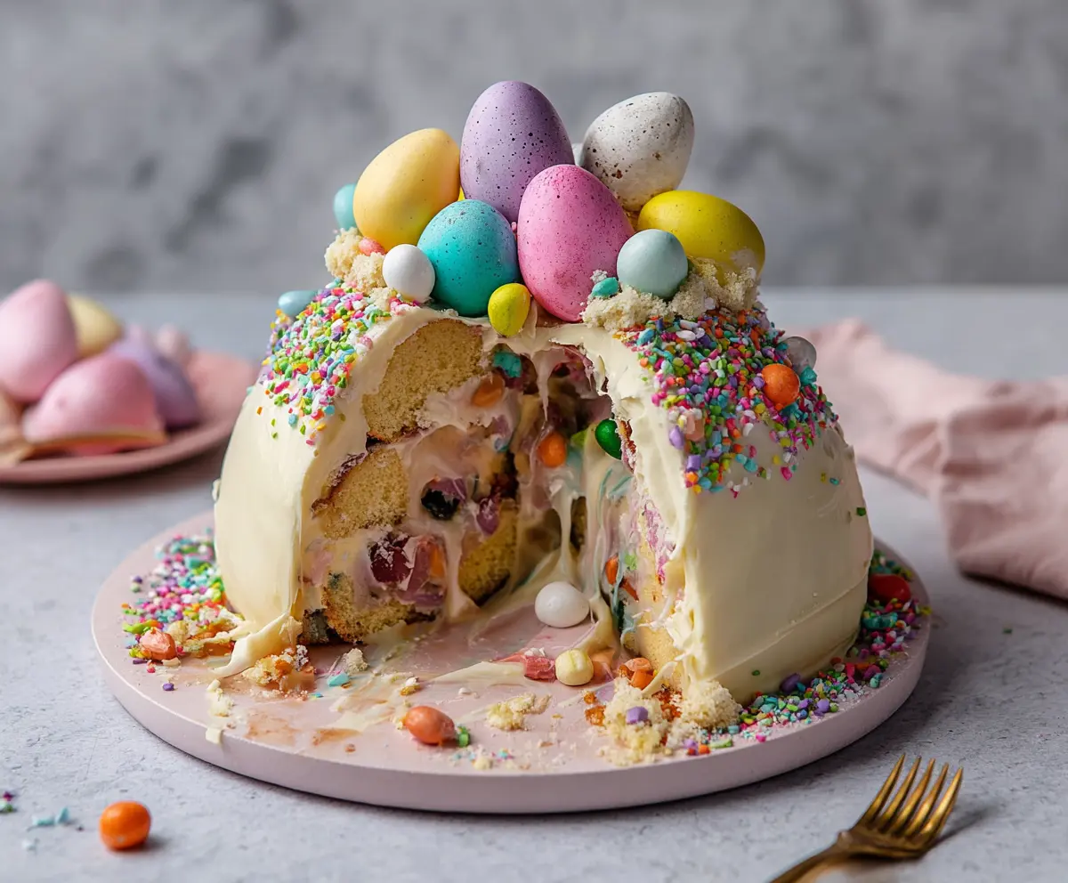 When it’s time to serve, gently break or smash the white chocolate shell to reveal the hidden candy eggs inside. Slice into the cake and enjoy the delicious surprise that awaits!