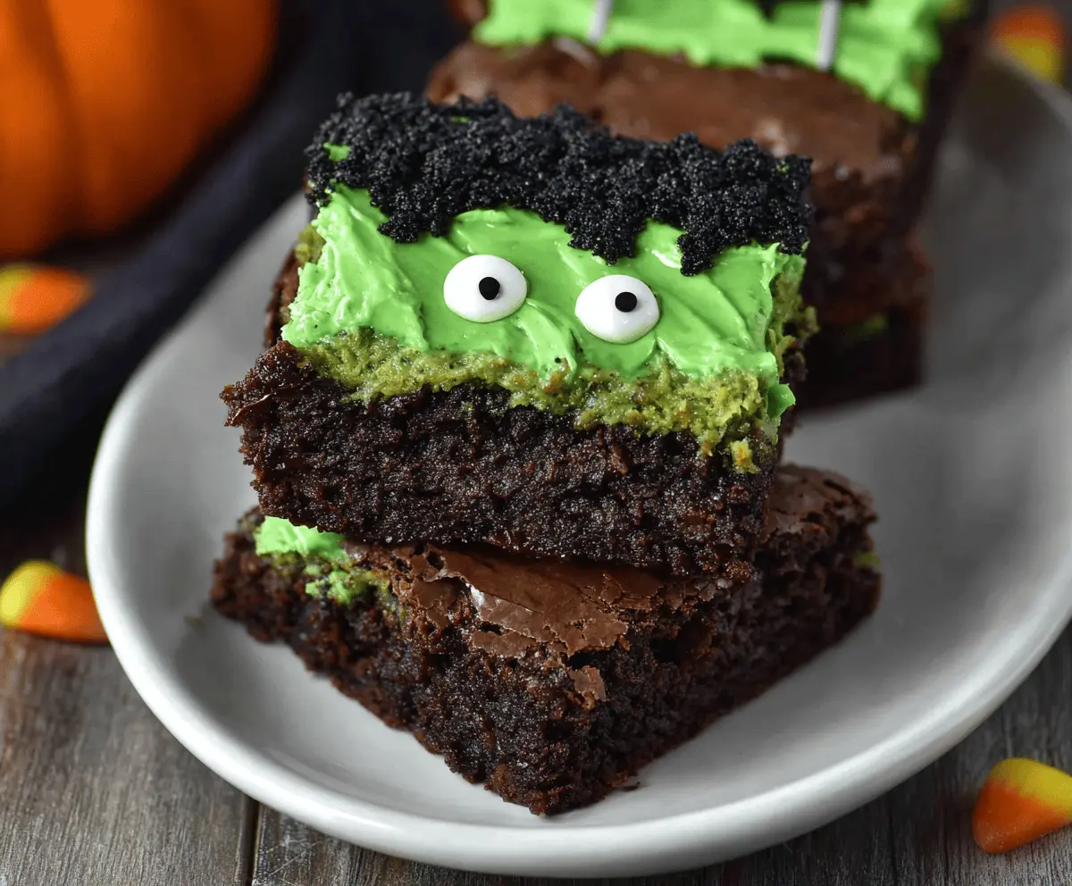 Delicious Frankenstein-themed brownies decorated with green icing, edible eyes, and spooky monster details for Halloween treats