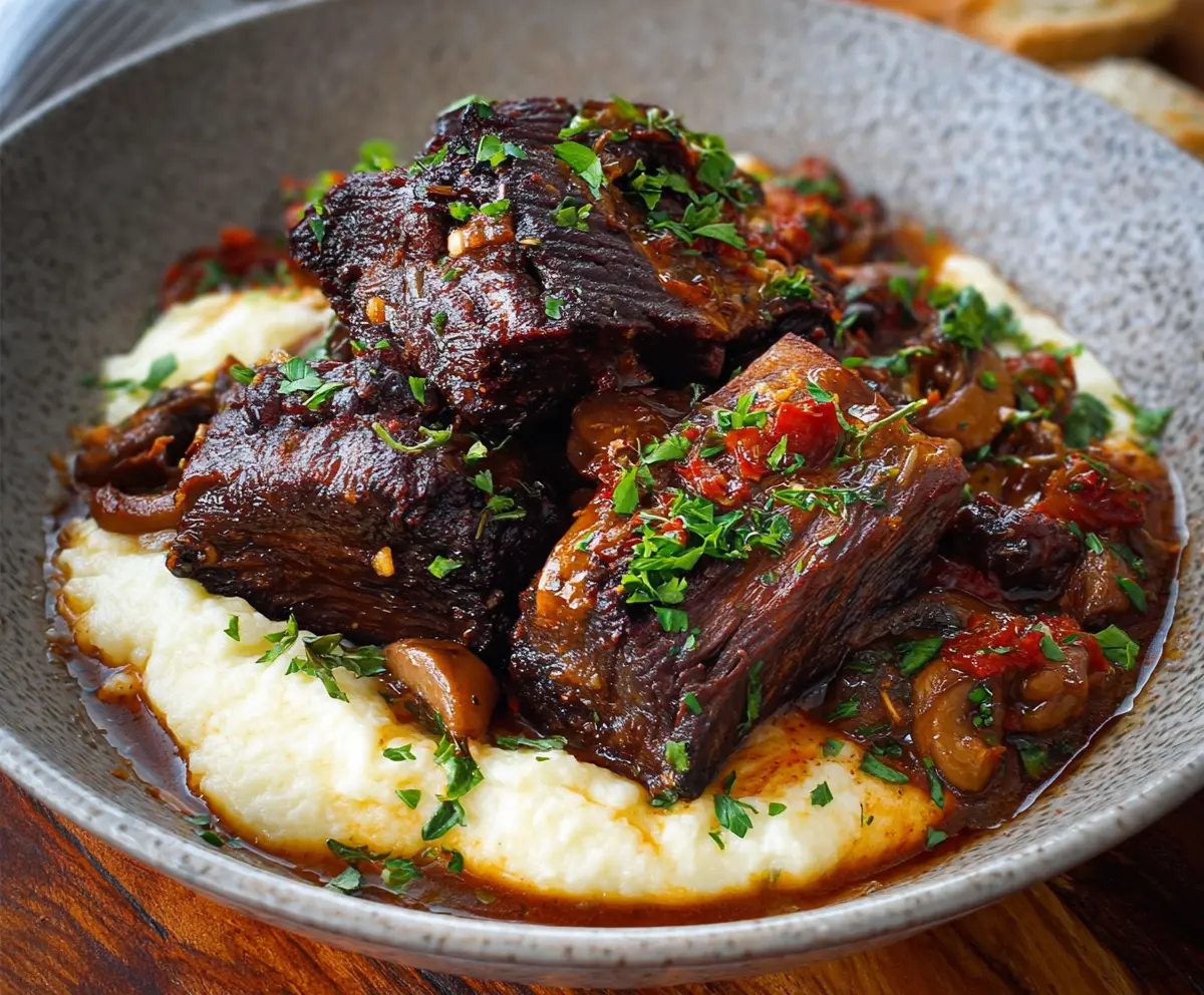 To serve, spoon the creamy polenta onto plates and top it with the tender braised short ribs, ladling over the rich sauce and mushrooms. Don’t forget to garnish with some fresh chopped parsley for a pop of color!