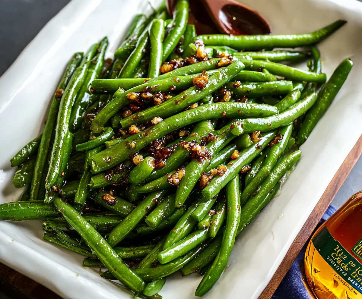 Yes, you can use frozen green beans! Just skip the blanching step since they’re already pre-cooked. Sauté them directly in the skillet with garlic and glaze ingredients, adjusting the cooking time to 5-7 minutes until heated through.