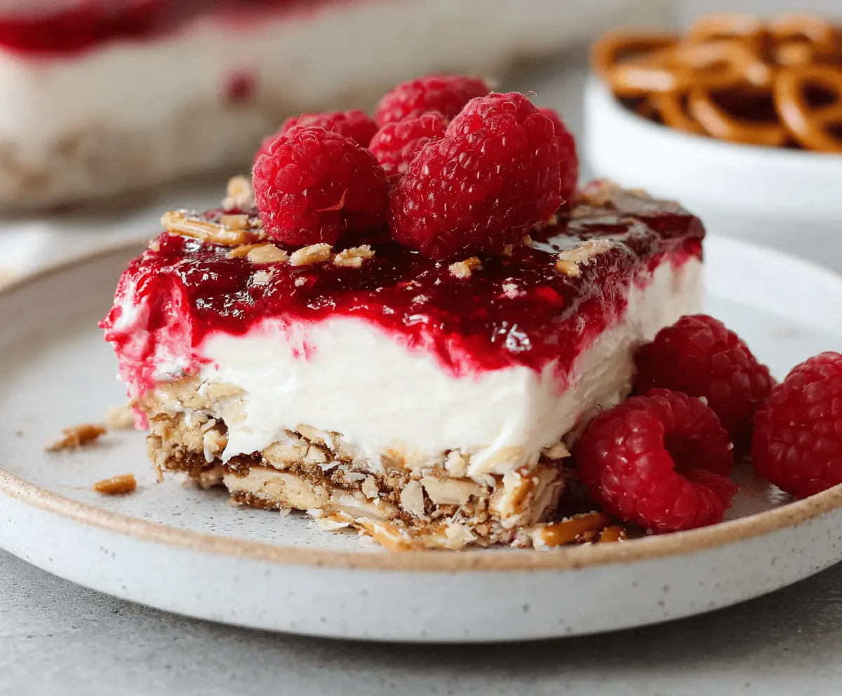 This delightful dessert features a crunchy gluten-free pretzel crust, a smooth creamy layer, and a fresh raspberry gelatin topping for a truly irresistible combination of textures and flavors. Enjoy your creation!