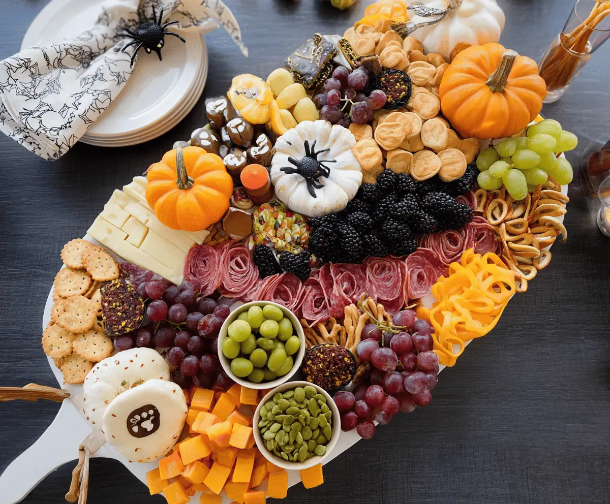 Add Halloween-themed candies or chocolates shaped like bats and skulls in small dishes or scatter them around the board to entice your guests!
