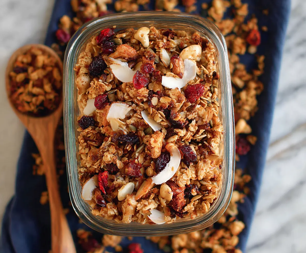 This Healthy Granola is a crunchy mix of oats, nuts, and seeds, sweetened naturally with honey or maple syrup. It’s perfect for breakfast or a quick snack!