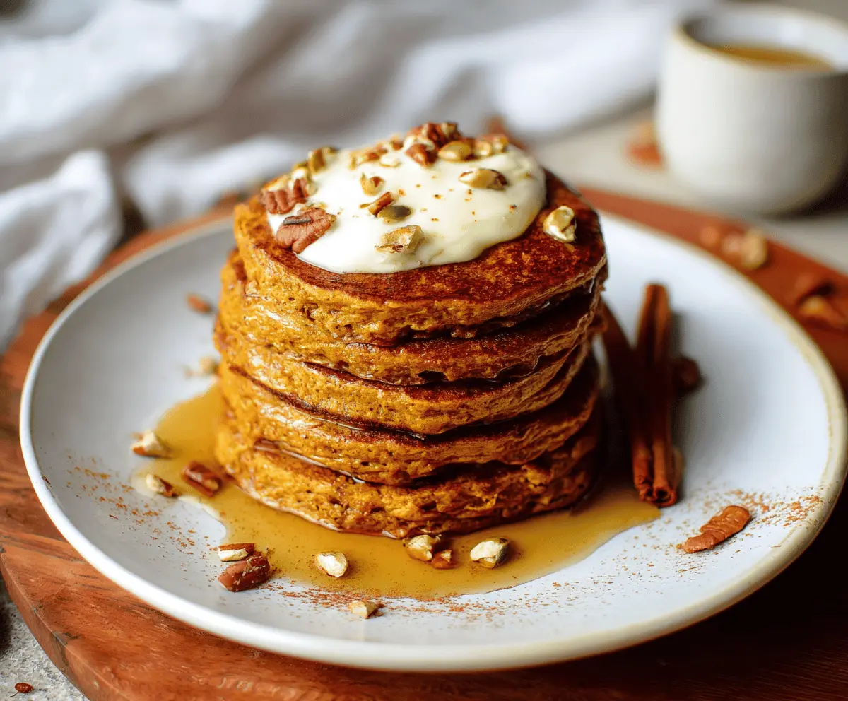 Once all pancakes are cooked, stack them on a serving plate. Drizzle with maple syrup and add a dollop of Greek yogurt or whipped cream. Sprinkle with chopped pecans or walnuts for an extra crunch!