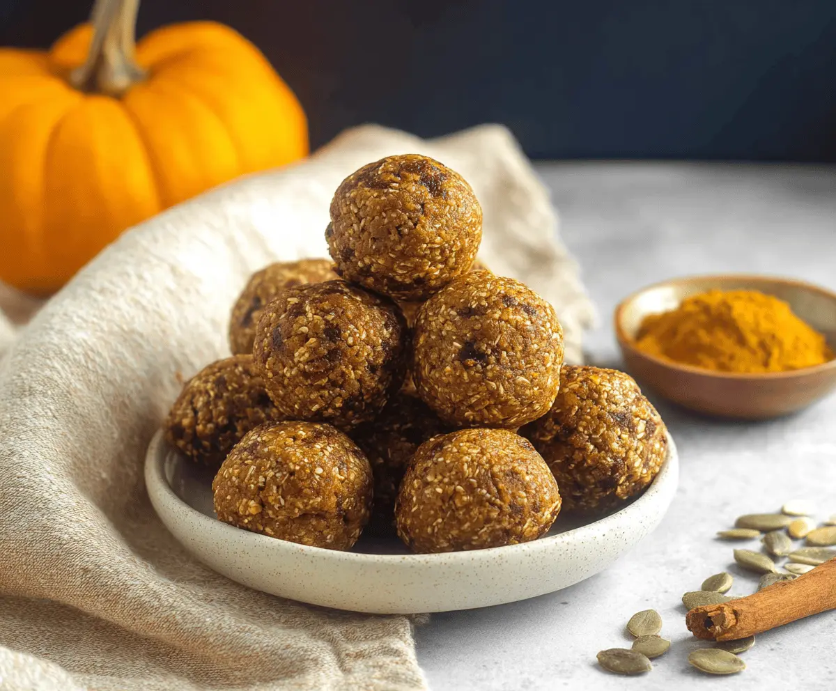 Delicious homemade healthy pumpkin spice protein balls on a white plate, perfect for a nutritious snack or energy boost