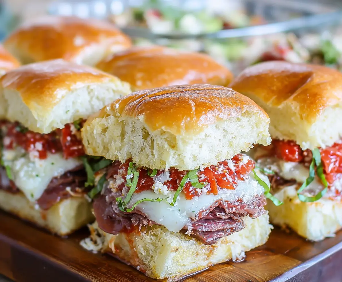 These sliders combine classic Italian deli flavors with a tangy herb dressing, all hugged by soft, slightly toasted rolls for a perfect bite-sized taste of an Italian grinder sandwich. Enjoy every delicious bite!