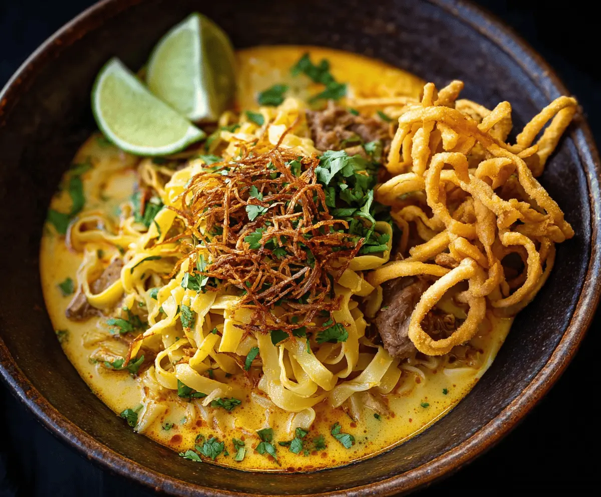 Delicious bowl of Khao Soi with creamy coconut curry noodles, tender chicken, crispy fried noodles, lime wedges, and fresh herbs on a traditional Thai plate