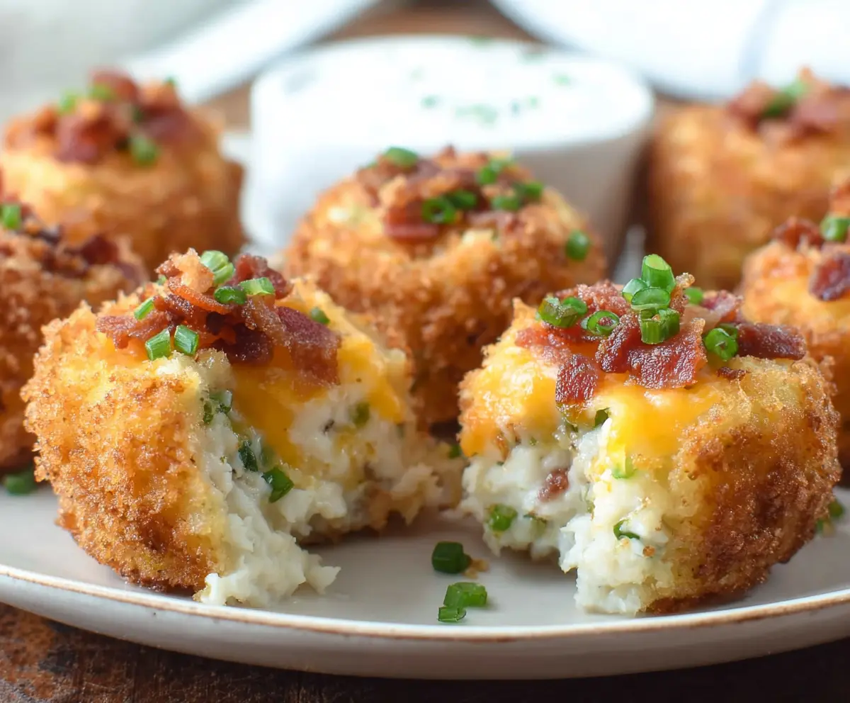 These Loaded Mashed Potato Bites are crispy little treats packed with cheesy goodness! Each bite is filled with creamy mashed potatoes, cheese, and crunchy bacon bits—yum!