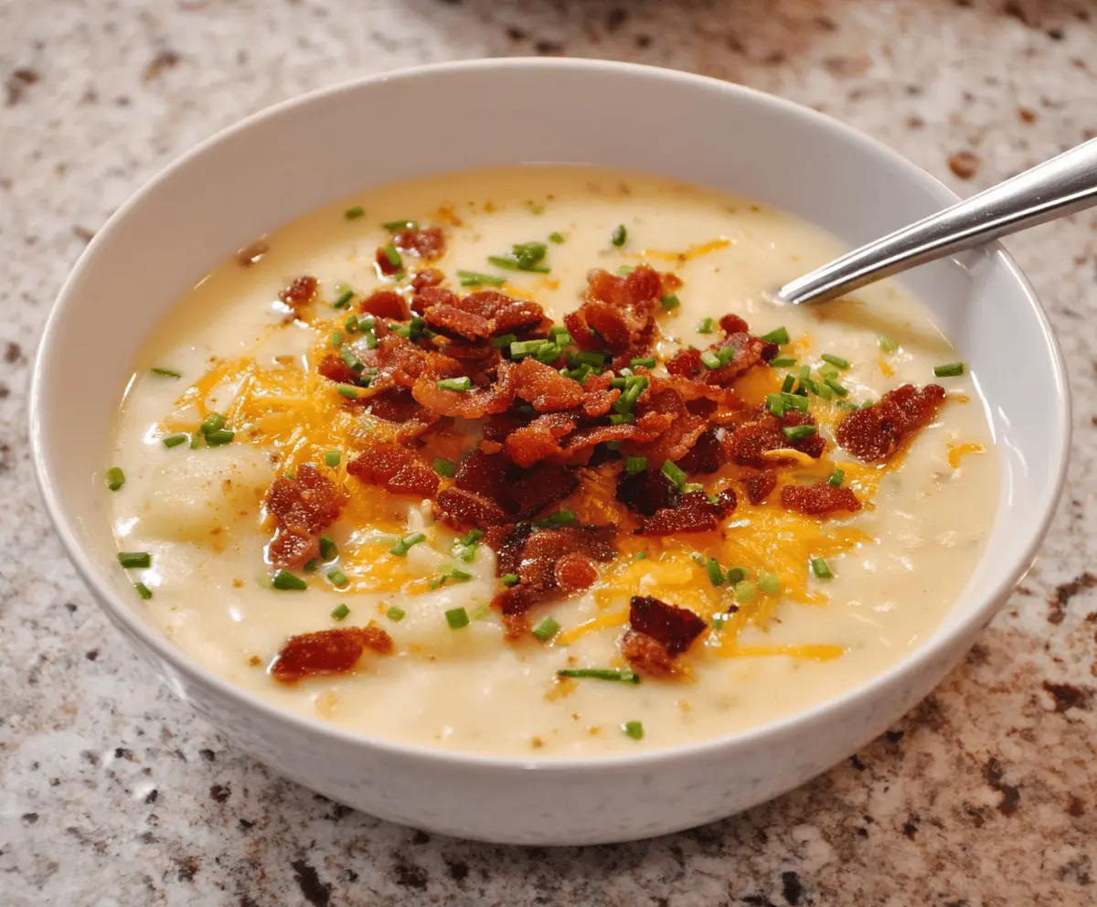 Creamy loaded potato soup topped with crispy bacon, shredded cheese, and chopped green onions in a bowl