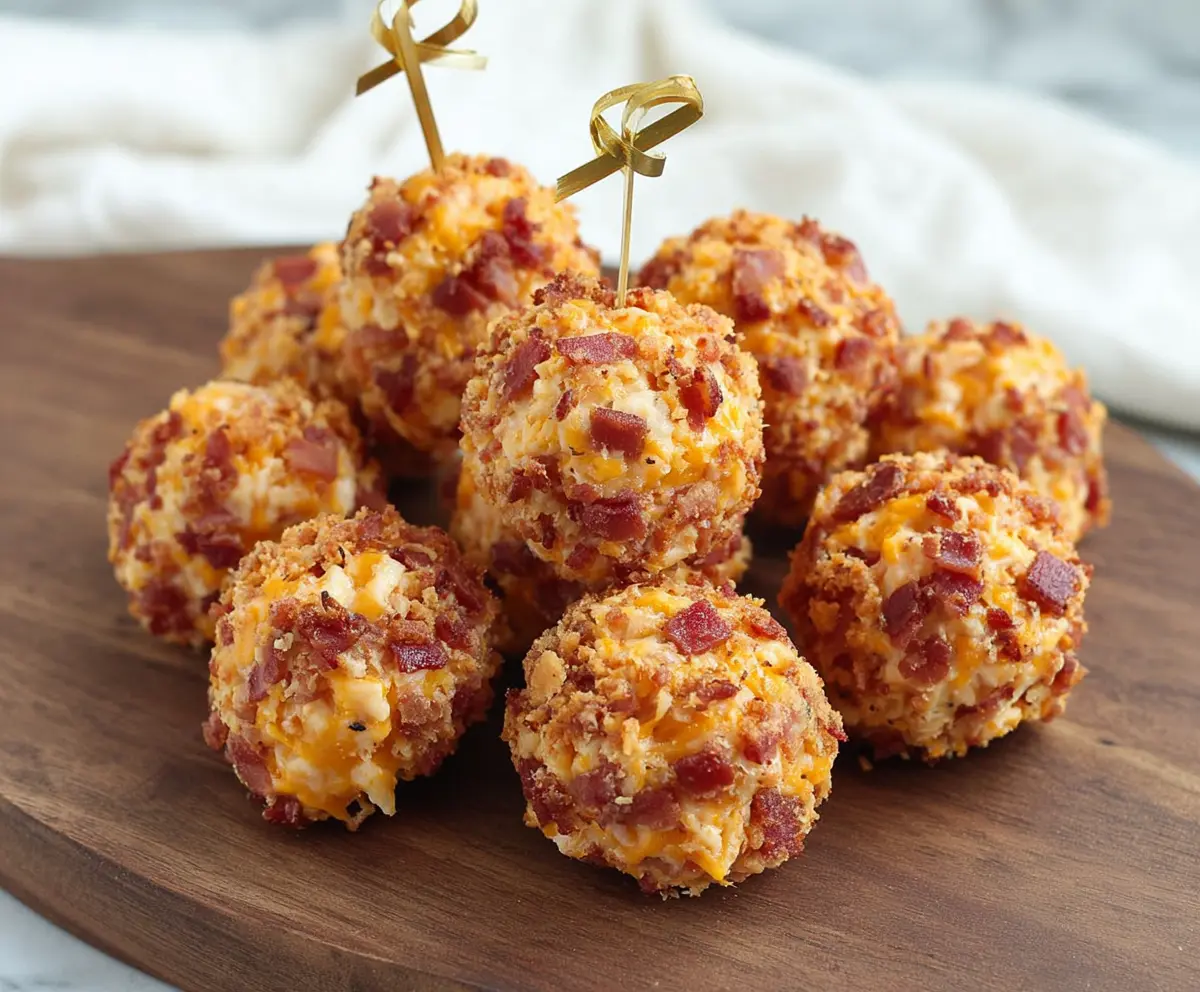 On a plate, mix together some extra chopped bacon and shredded cheddar cheese. Take each cheeseball and roll it in this mixture to coat the outside. This adds an extra crunch and flavor to your cheeseballs!