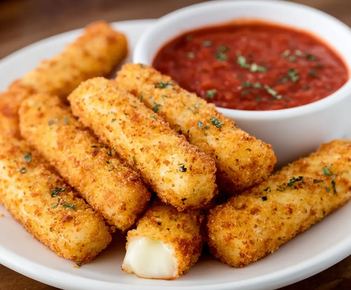 Enjoy your crispy homemade mozzarella sticks with rich, flavorful marinara sauce!