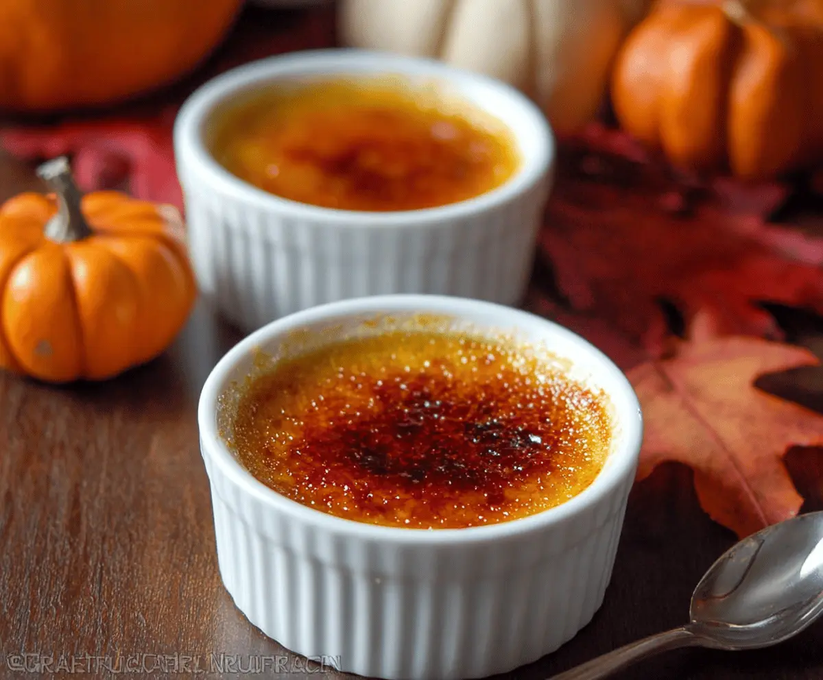 Creamy pumpkin creme brulee topped with caramelized sugar and whipped cream, perfect for fall desserts.