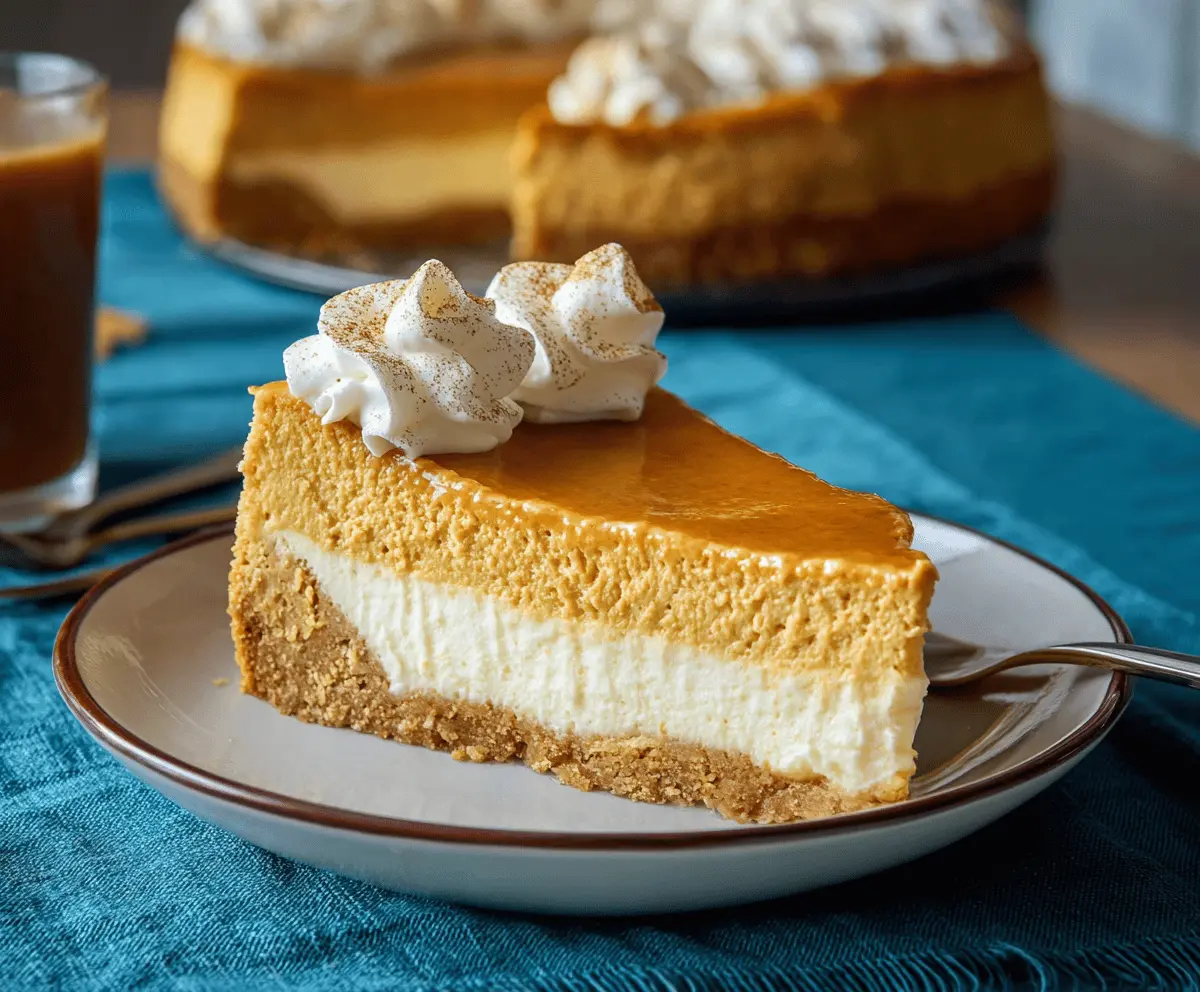 This treat is sure to be a crowd-pleaser with its smooth layers of pumpkin and cheesecake, all nestled in a crunchy graham cracker crust. Happy baking!