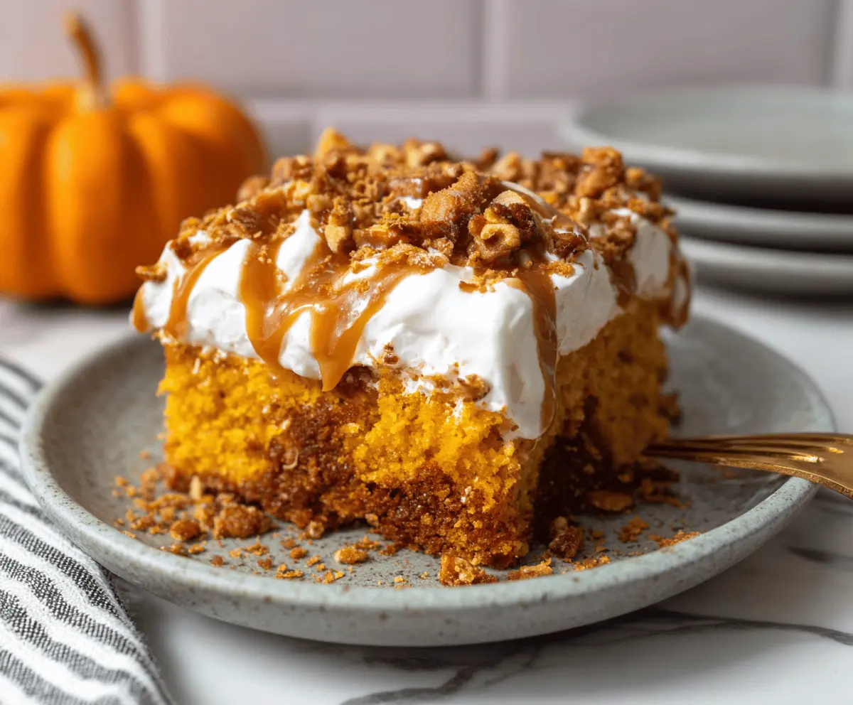 Delicious Pumpkin Poke Cake topped with whipped cream and cinnamon, perfect for fall dessert.