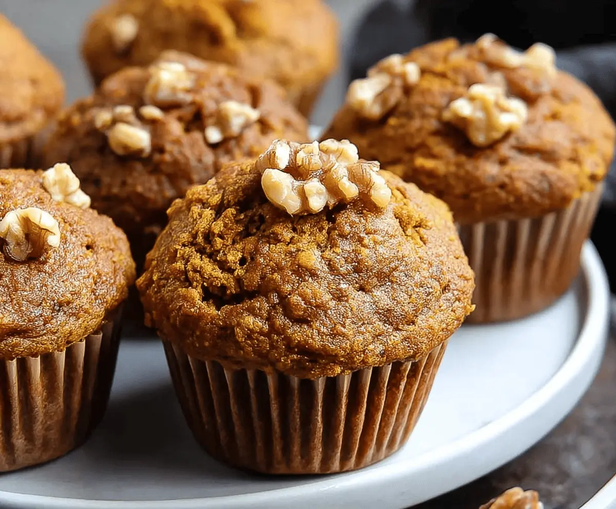Freshly baked pumpkin walnut muffins on a plate, featuring moist pumpkin batter with walnuts, perfect for breakfast or snack.