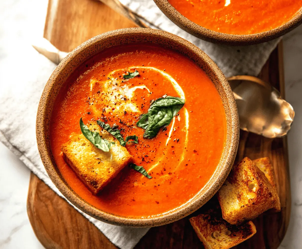 Serve the soup hot, topped with a swirl of cream, a sprinkle of black pepper, fresh basil leaves, and croutons or toasted bread on the side. Enjoy this comforting and flavorful dish!