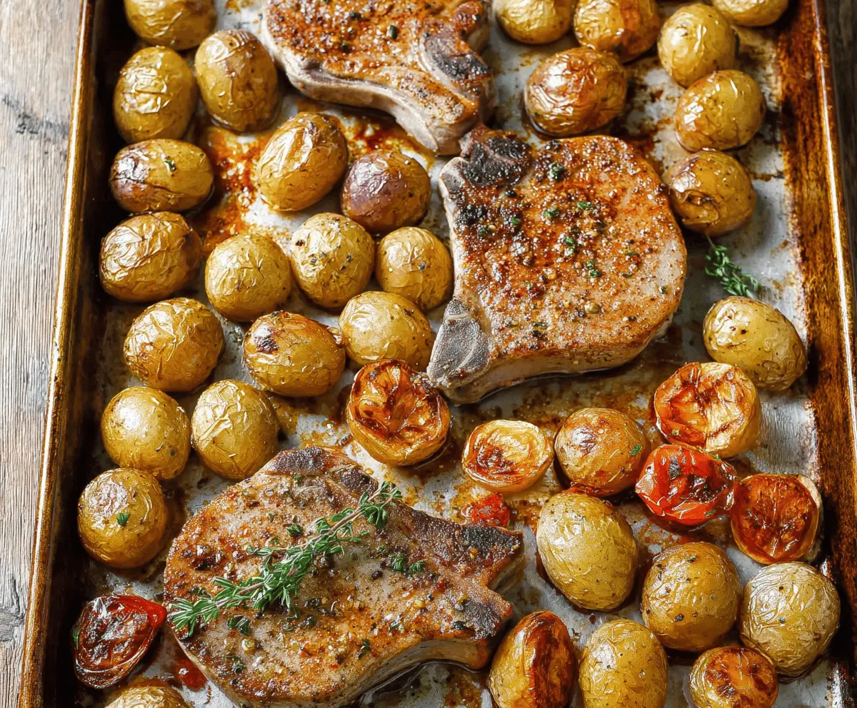 Delicious sheet pan pork chops with crispy potatoes and fresh herbs ready for a flavorful dinner