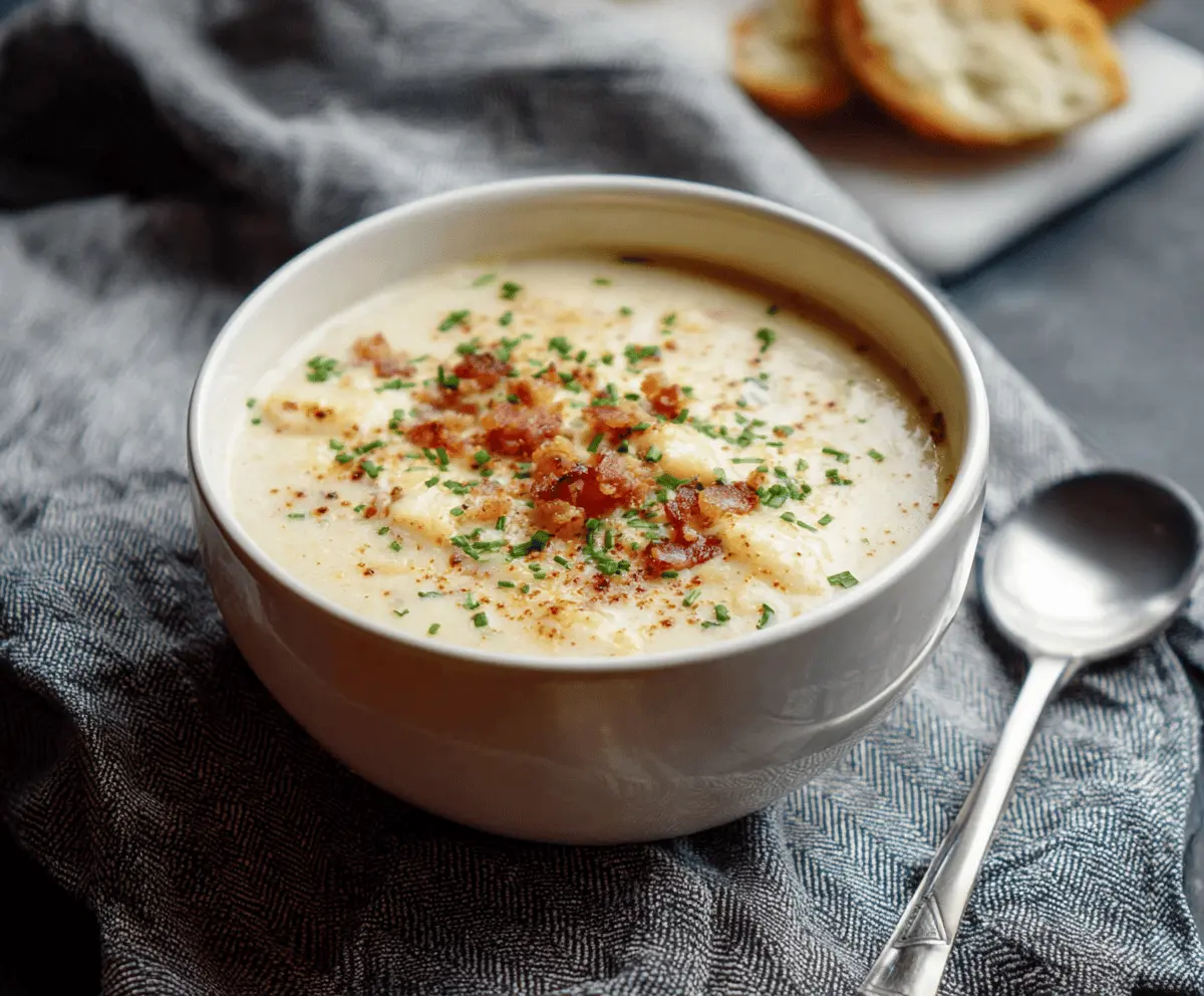 Serve the soup hot, garnished with the crumbled bacon, chopped chives, and additional shredded smoked Gouda if desired. It’s the perfect topping for a cozy finish!