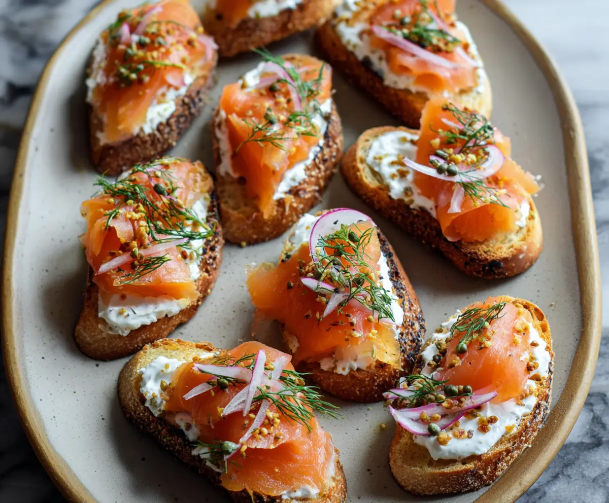 Smoked Salmon Crostini is a tasty snack that everyone will love! Thin slices of smoky salmon sit on top of crispy bread, topped with cream cheese and a sprinkle of dill.