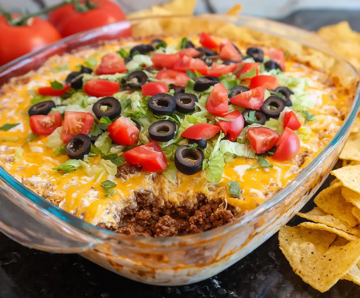 Dig in! This taco dip is best served warm, paired with plenty of tortilla chips for the perfect scooping experience. Enjoy this tasty treat at your next gathering!