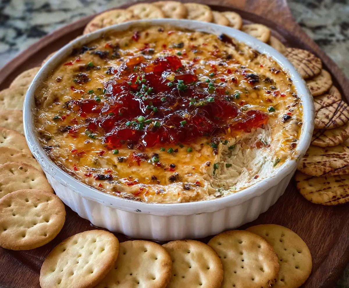 Sprinkle some chopped parsley or chives on top for a fresh touch. Now, it’s time to dip! Serve it warm with your favorite crackers around the dish for an easy and delicious snack.