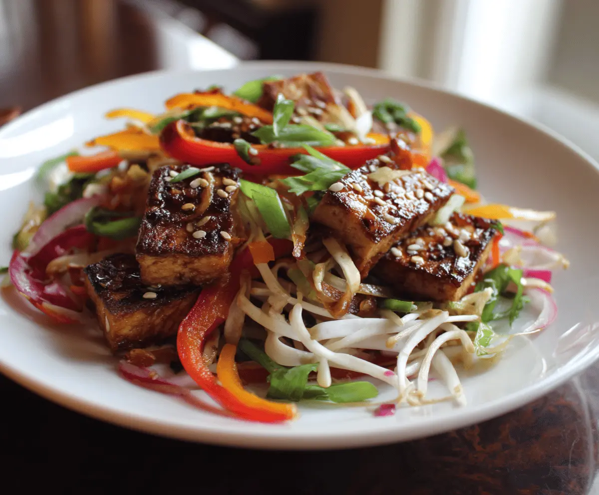 This Tofu Stir-Fry with Vegetables is a colorful and healthy dish. It features crispy tofu and a mix of fresh veggies like bell peppers, broccoli, and carrots, all cooked together in a tasty sauce.